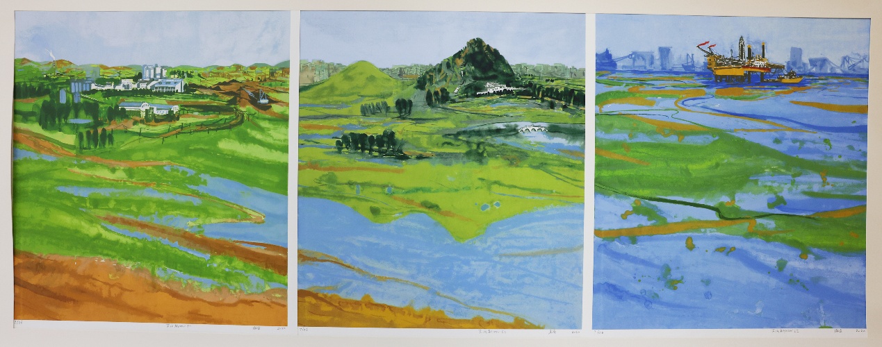 奔腾的黄河水与葱郁的生态绿洲交织,这幅丝网版画以叠压的色块与简练线条,再现母亲河焕发的崭新生机。不仅是自然画卷,更是永续发展的时代印记。