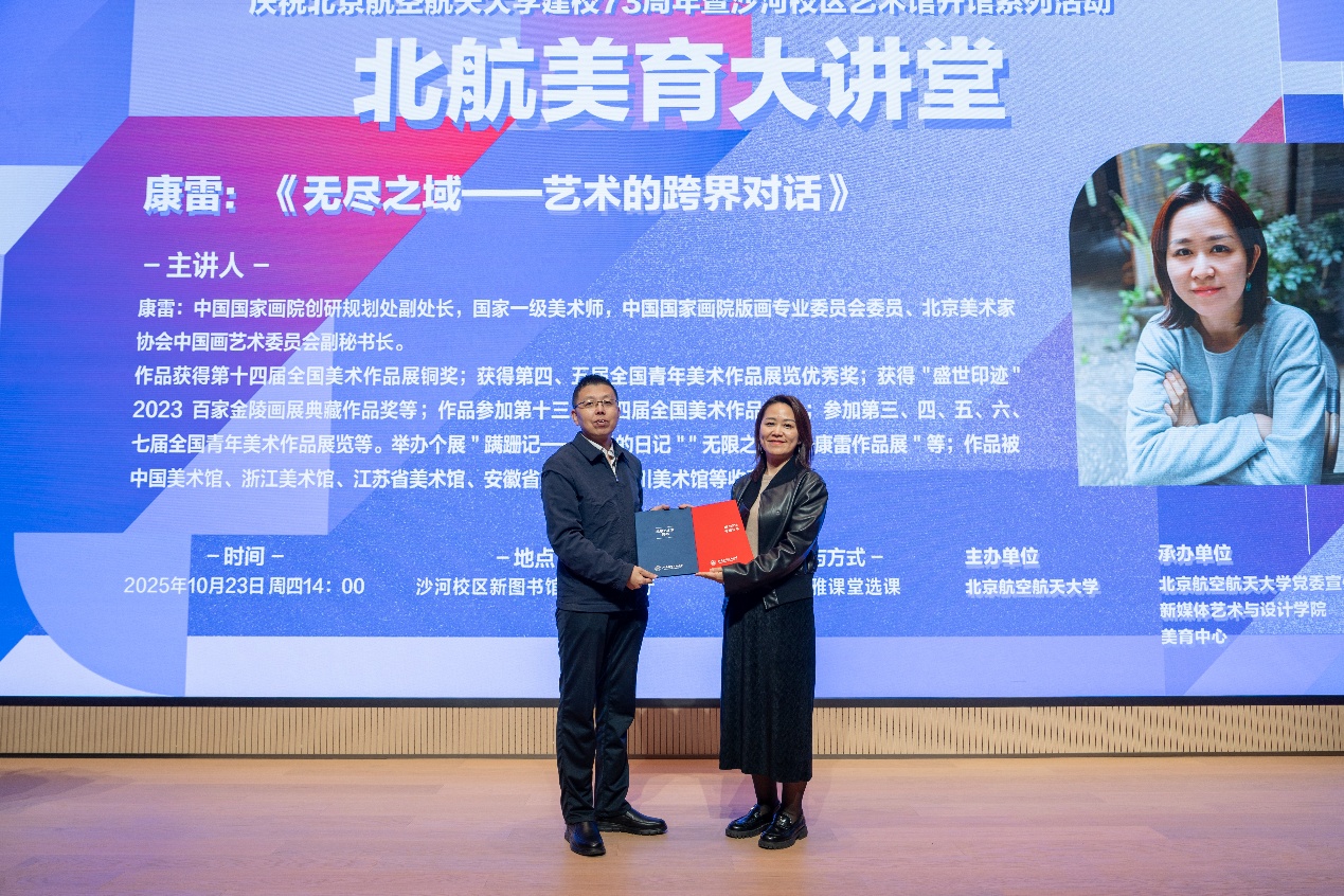为庆祝北航建校73周年暨沙河校区艺术馆开馆,1023日下午,北航美育中心特邀中国国家画院创研规划处副处长、国家一级美术师康雷做客美育大讲堂,为师生带来开馆系列活动的第三场美育主题讲座“无尽之域——艺术的跨界对话”。讲座由北航美育中心副主任宋泽惠主持。