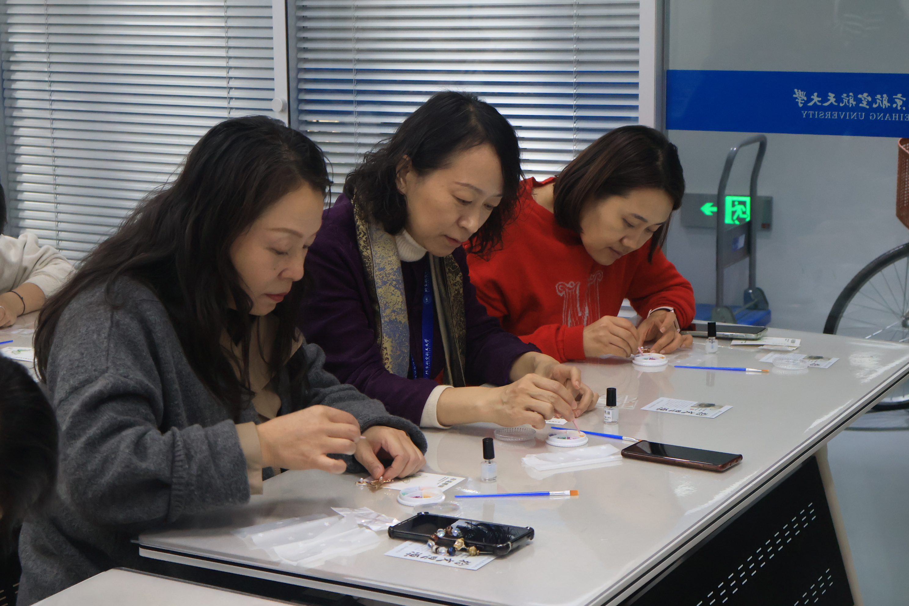 活动现场笑语盈盈,近50名参与者均顺利完成作品,不少老师当场佩戴上自己亲手制作的螺钿胸针,脸上洋溢着满满的成就感。大家纷纷表示,这次体验不仅学会了一项传统手艺,更在慢下来的创作过程中释放了工作压力,深刻体会到“工匠精神”中专注、严谨的内核。来自不同机关部处与学院的教职工们通过活动增进了交流,在共同感受非遗之美的过程中凝聚了情感。
